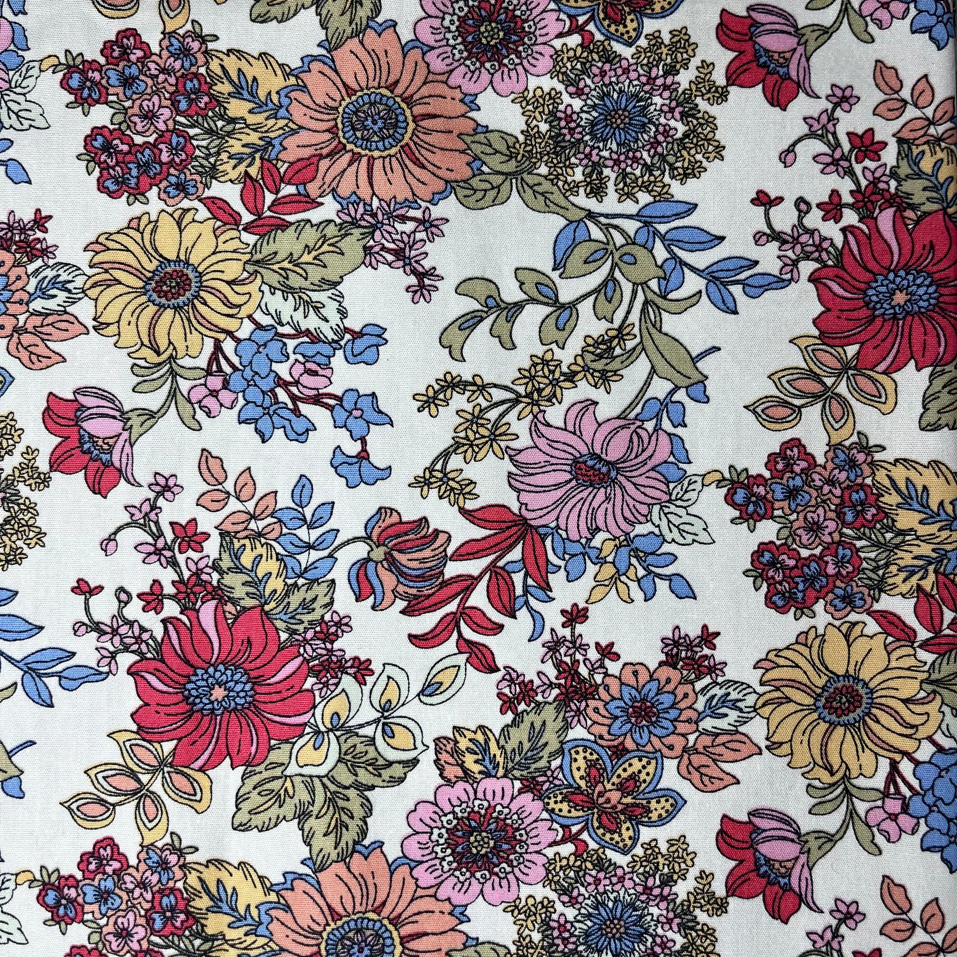 🎨 Print: Delicate floral illustrations with bold yellow, red, pink, blue, and green accents