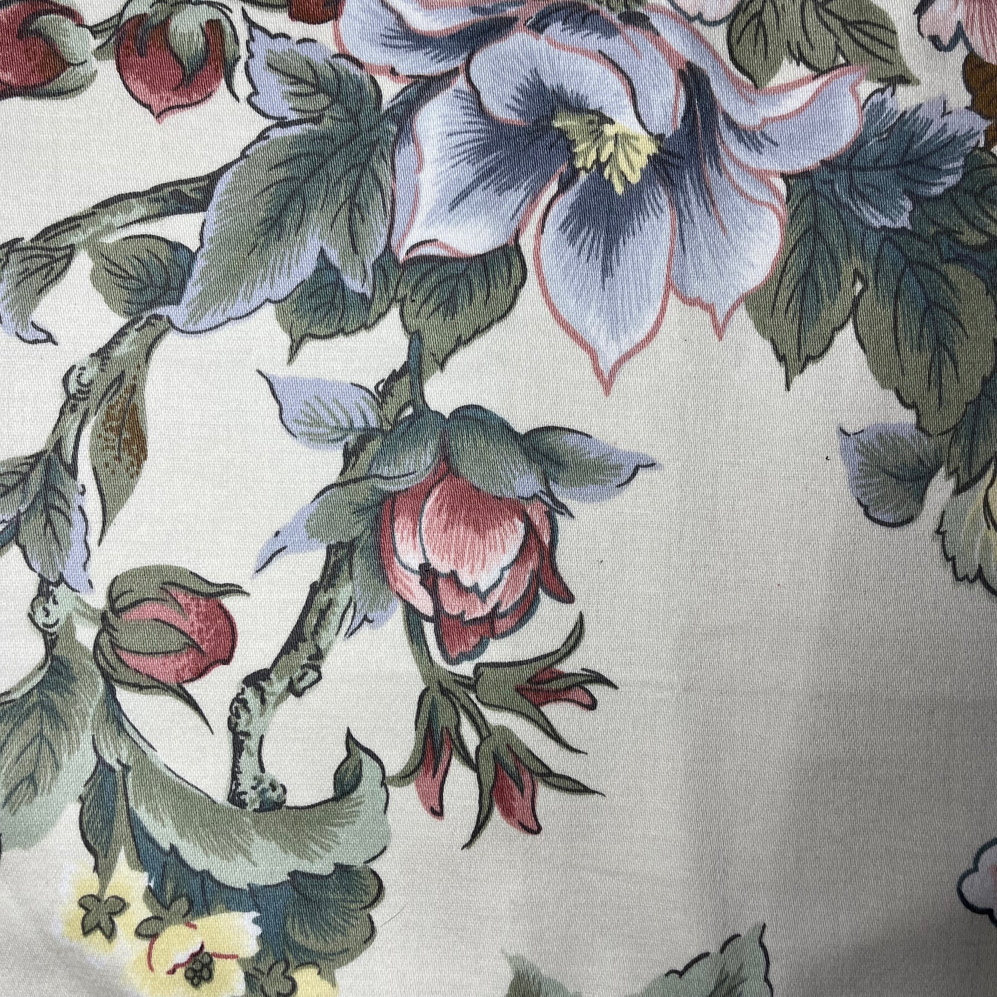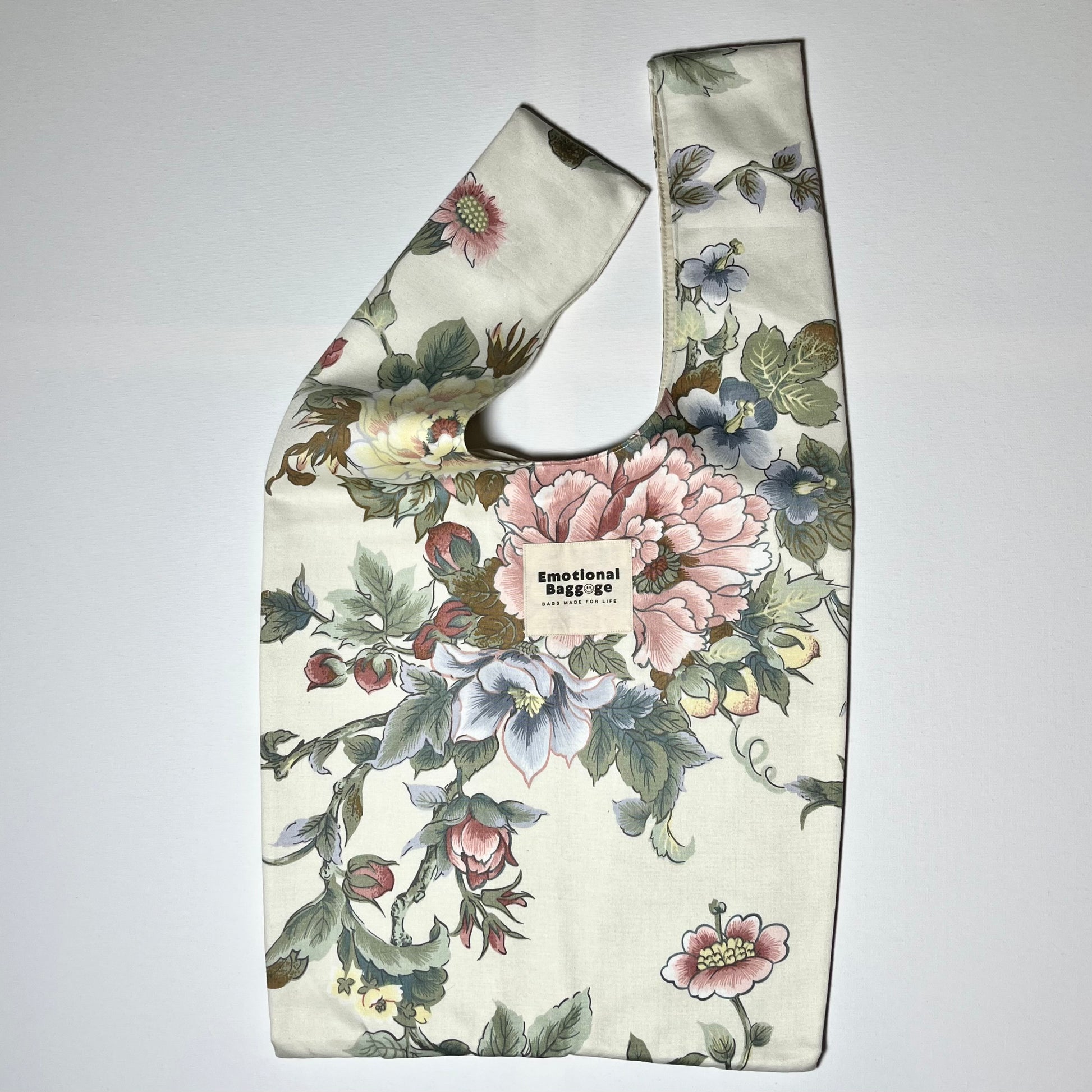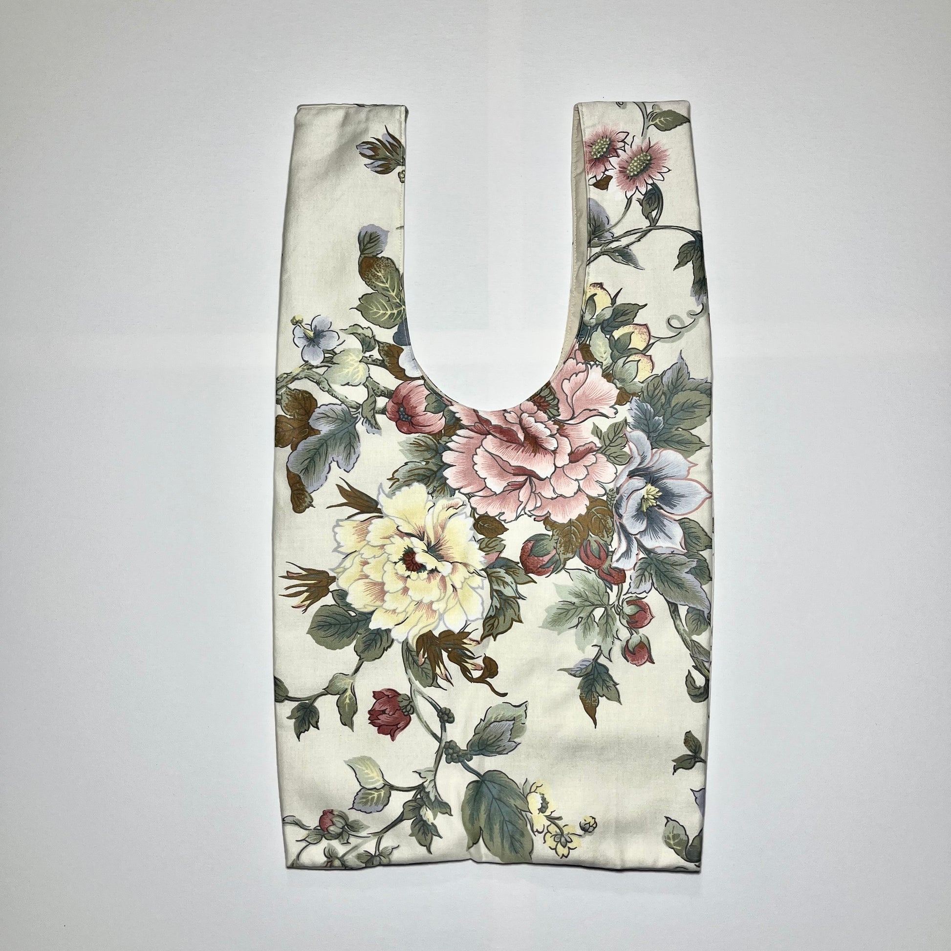 Handmade in the UK, this unique shopper bag is crafted from a repurposed vintage curtain, breathing new life into classic materials. Featuring a soft cream base with a delicate floral pattern in pastel shades of pink, blue, lilac, and yellow, this bag embodies timeless vintage charm. The thick, curtain-style outer fabric ensures durability, while the beige cotton lining adds a subtle, refined touch. A beautiful and sustainable alternative to single-use plastic bags.