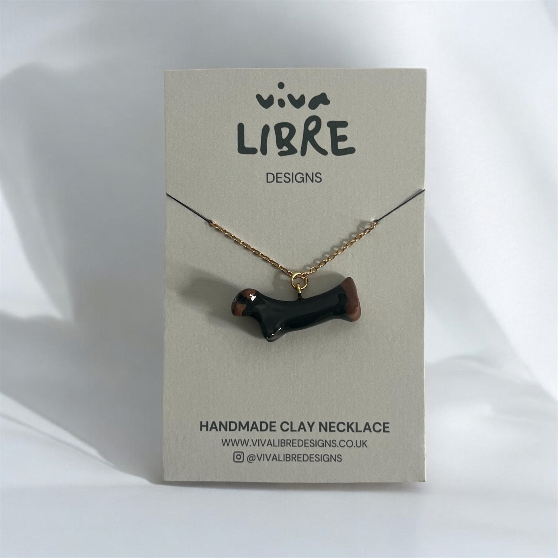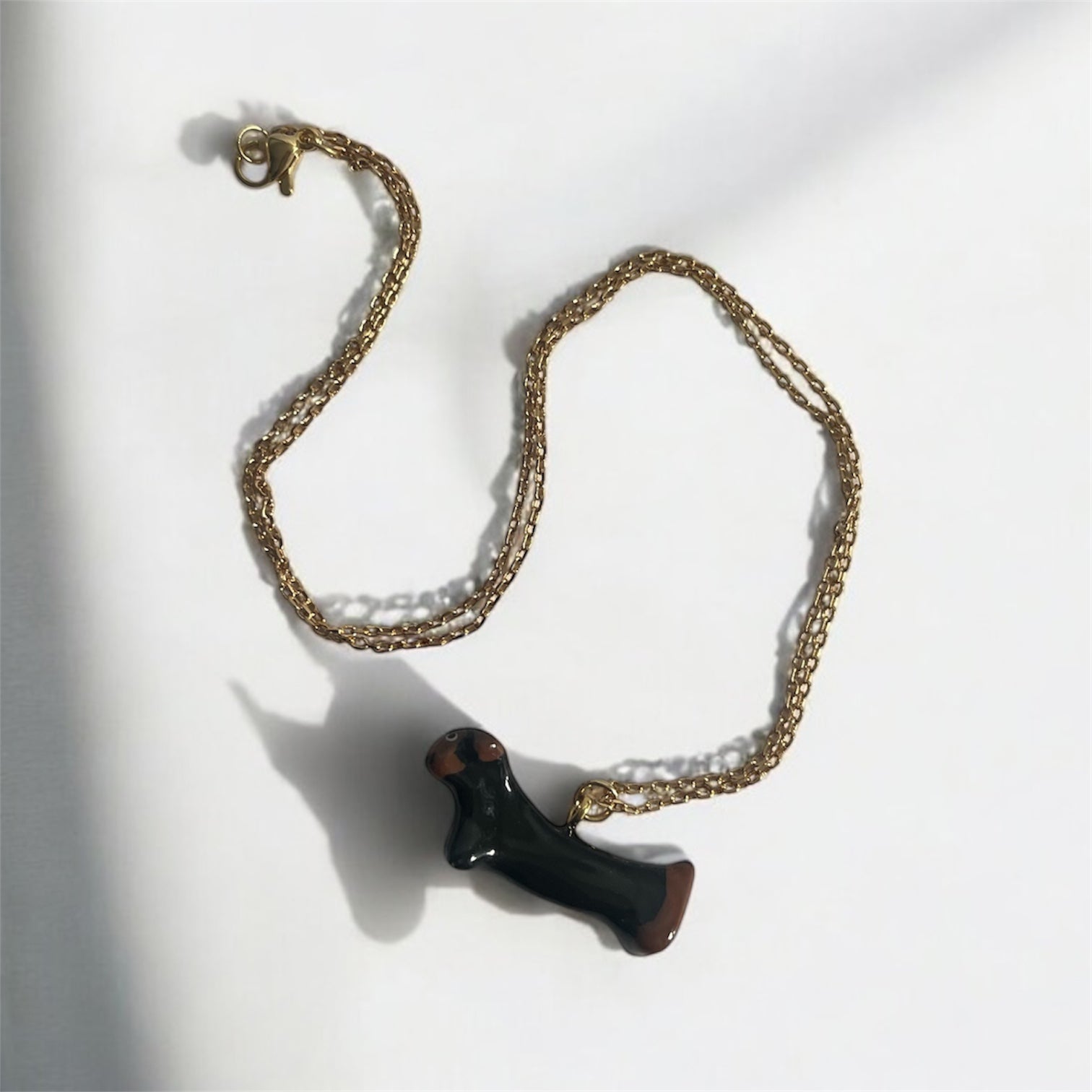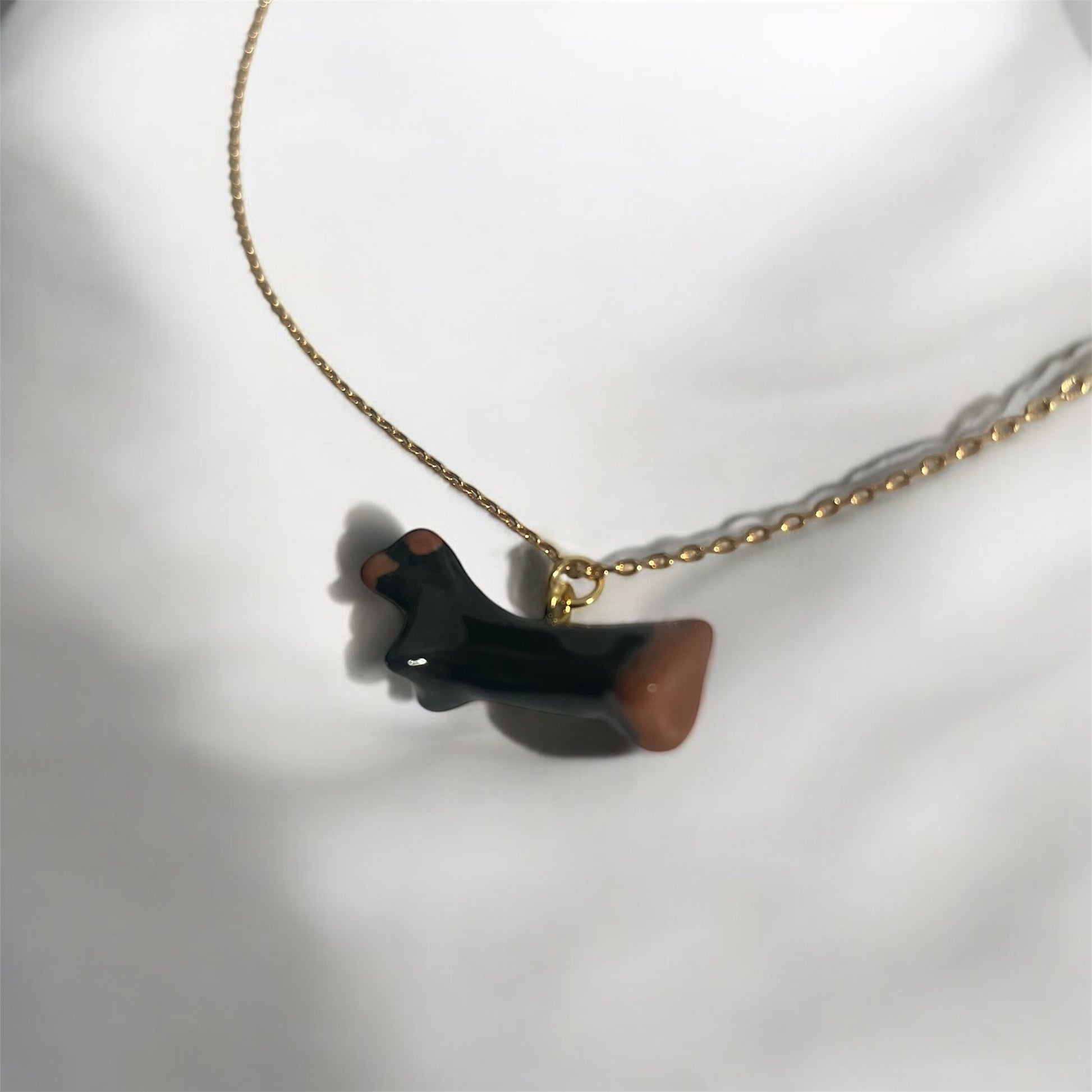 Handmade in the UK, this adorable sausage dog pendant necklace is crafted from clay, hand-painted with care, and finished with a glossy resin coating—making each pup completely one of a kind. Featuring a smooth, sculpted design and rich black and brown tones, this playful piece brings a little charm to your everyday look. The pendant is paired with an 18k gold-plated chain and findings for a polished finish.